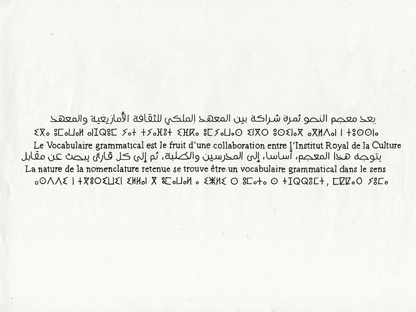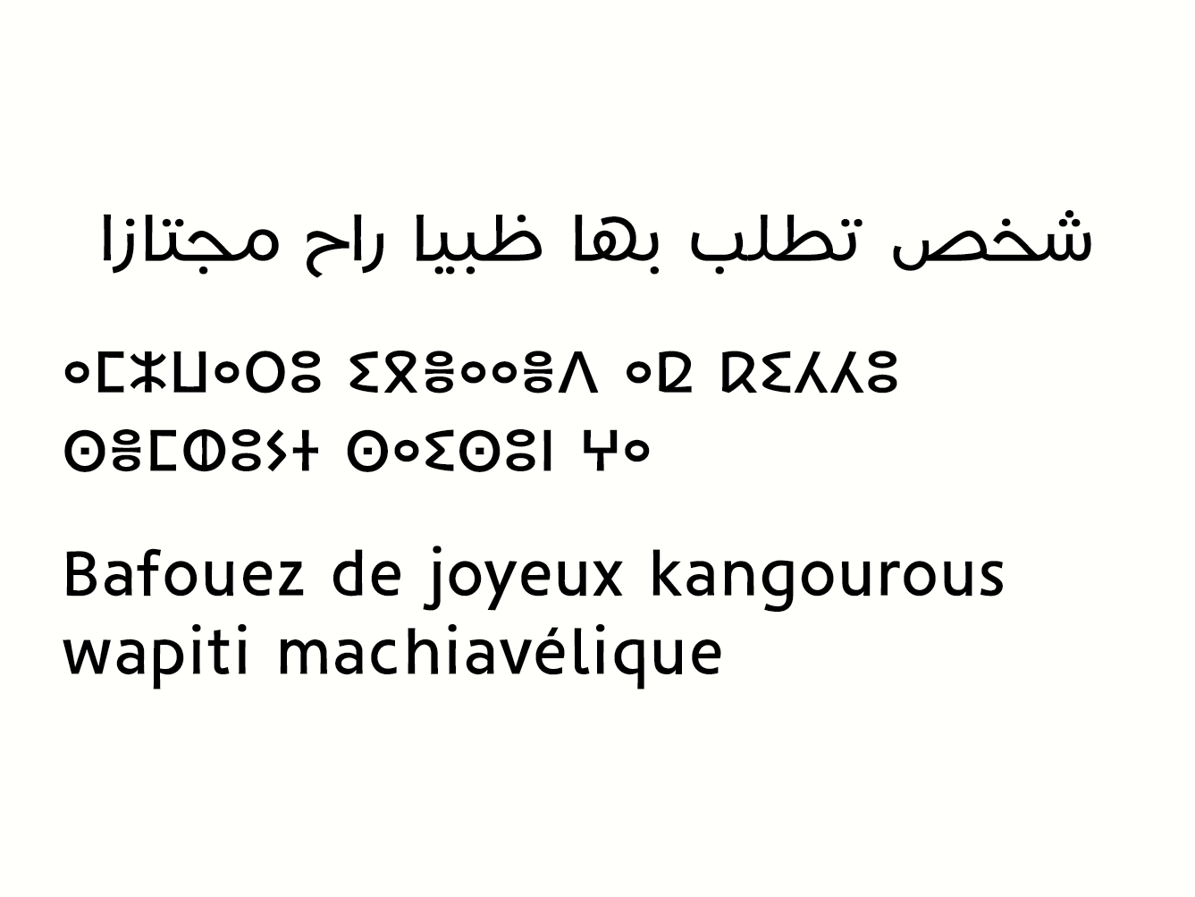 On one hand, there is Arabic, with its calligraphic tradition. On the other hand, Latin has a rich written and typographic history. Finally there is Tifinagh, with no writing, calligraphic or typographic history. It currently appears in a quasi-archaic state.