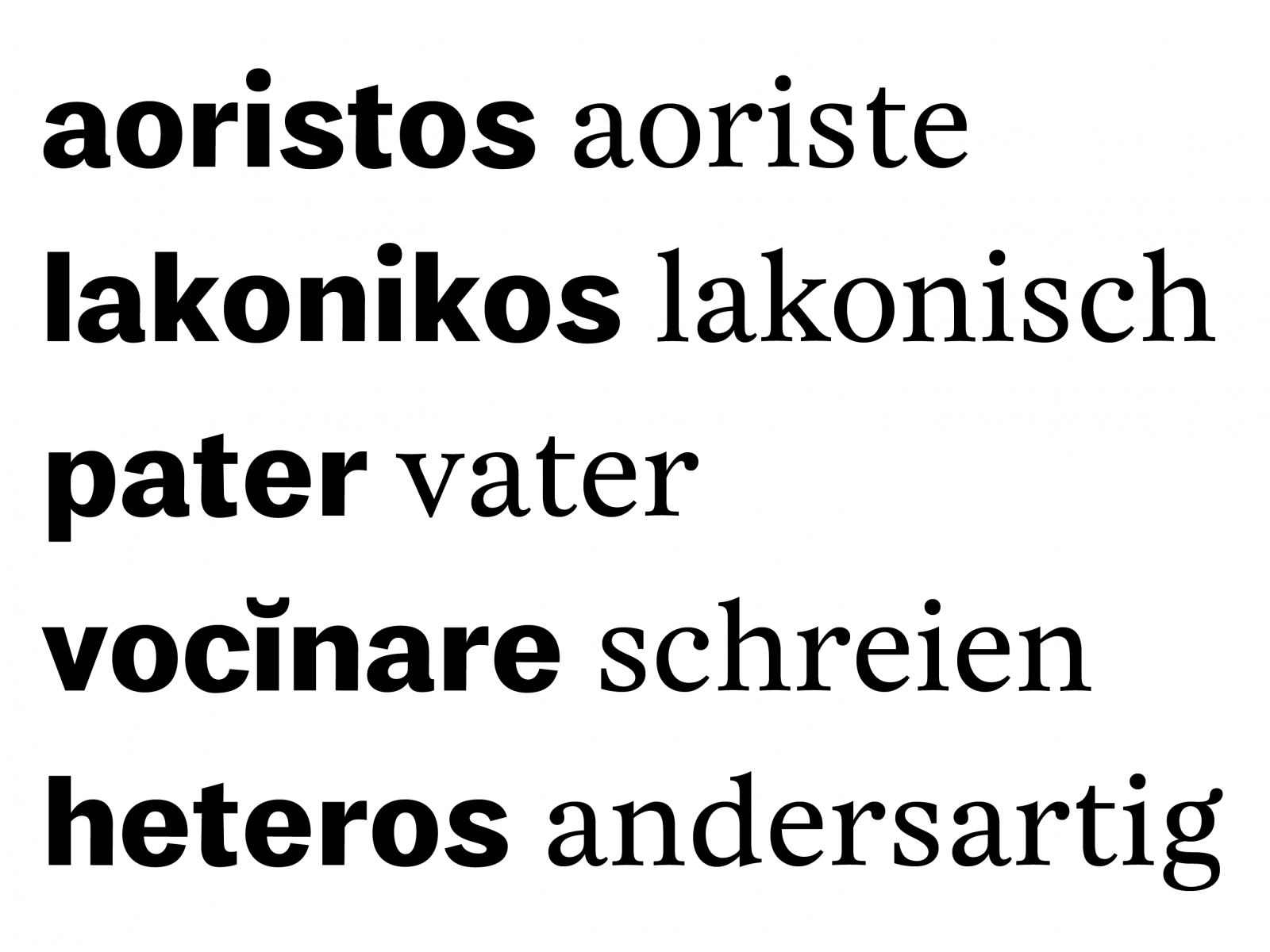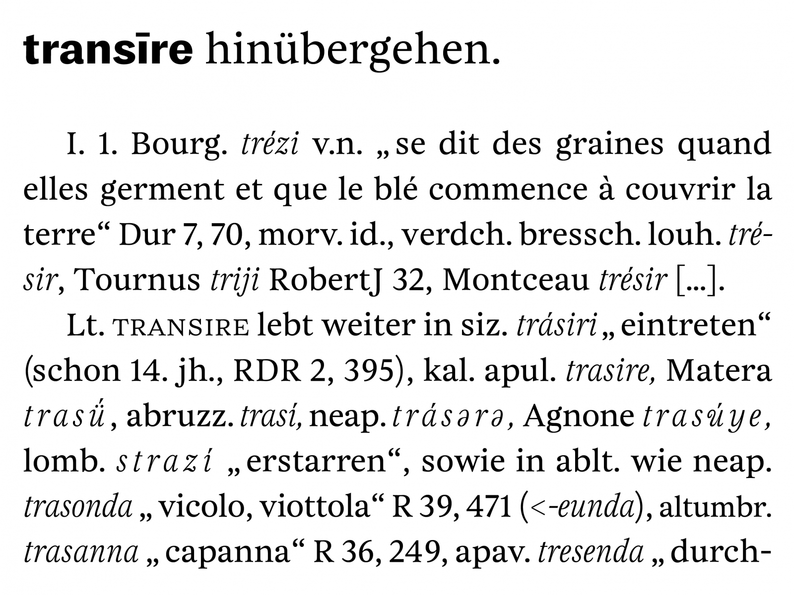 A partnership between the FEW Centre (which is part of ATILF) and ANRT was set up in order to conceive a series of new typefaces, as well as to redesign the printed version of the dictionary and to conceive its future electronic layout, all tailored to the FEW. The linearity of the articles is disrupted by the frequent use of capitals, figures and punctuation marks. The proportions of the roman typeface have been determined with the aim to minimize their impact. Increasing the horizontal proportions of the lowercase letters also enabled me to harmonize the rhythm of the text. I frequently wondered how much the silhouette of words set in italic should stand out, since their identification is really important. After several trials, it seemed interesting not to base my drawings on a strict skeleton that would have resulted in a uniform family, but to play instead on different kinds of structures and weights to help identifying the different parts of the article. The complex structure of the articles assigns to each typographic style a specific semantic function. Thus, the stylistic conventions have to be handled carefully. The stylistic autonomy of each typeface has been strengthened through regular communication with the team of linguists at ATILF. The beginning of each article is highlighted by a very bold typeface. The roman face used throughout the article sets in a much more discreet way the many bibliographical fields. The variants of the etymon, whether composed in italic or in roman small capitals, stand out from the rest of the text thanks to their light weight. The dictionary consultation schemes will be the next territories to invest.