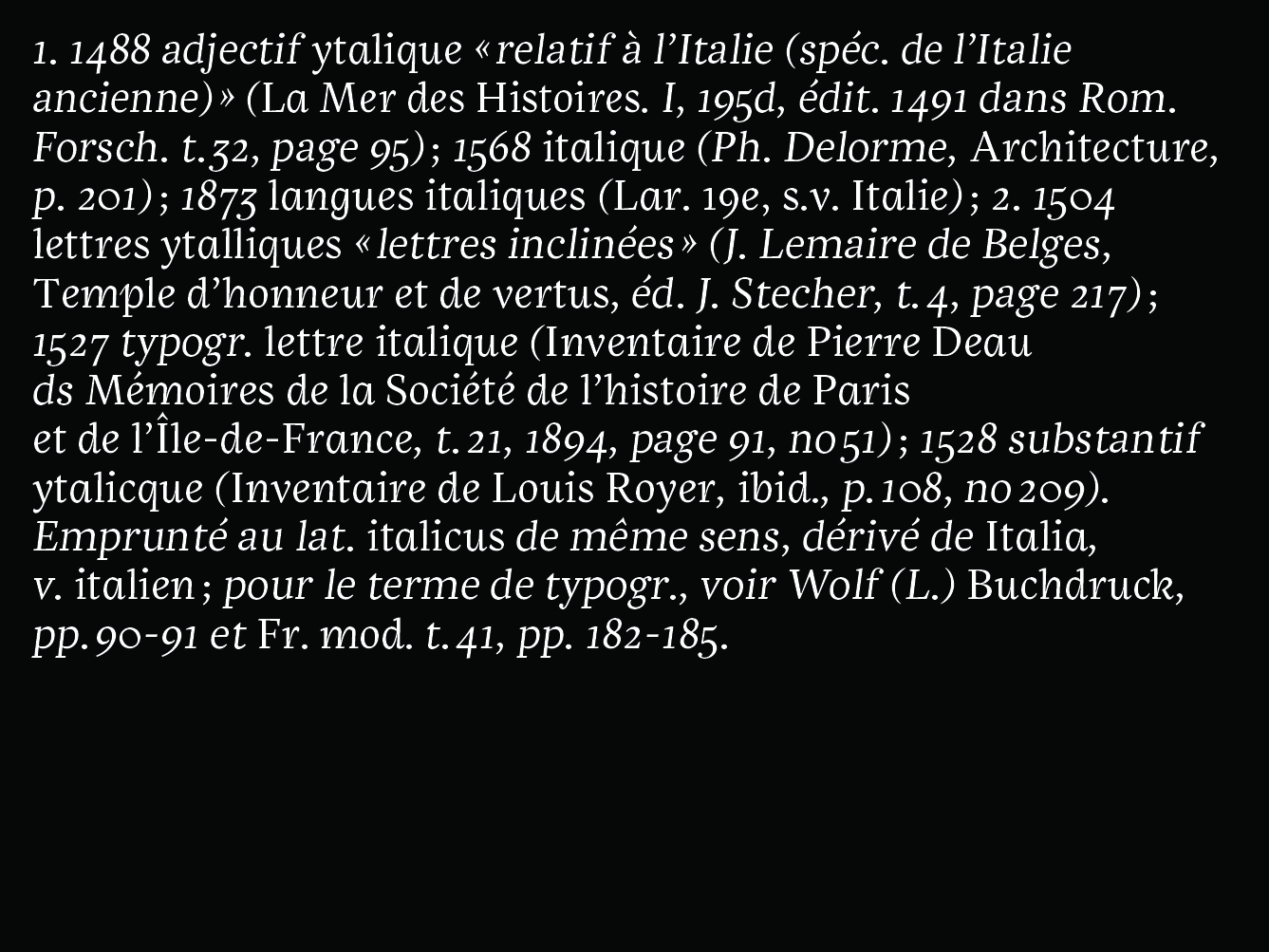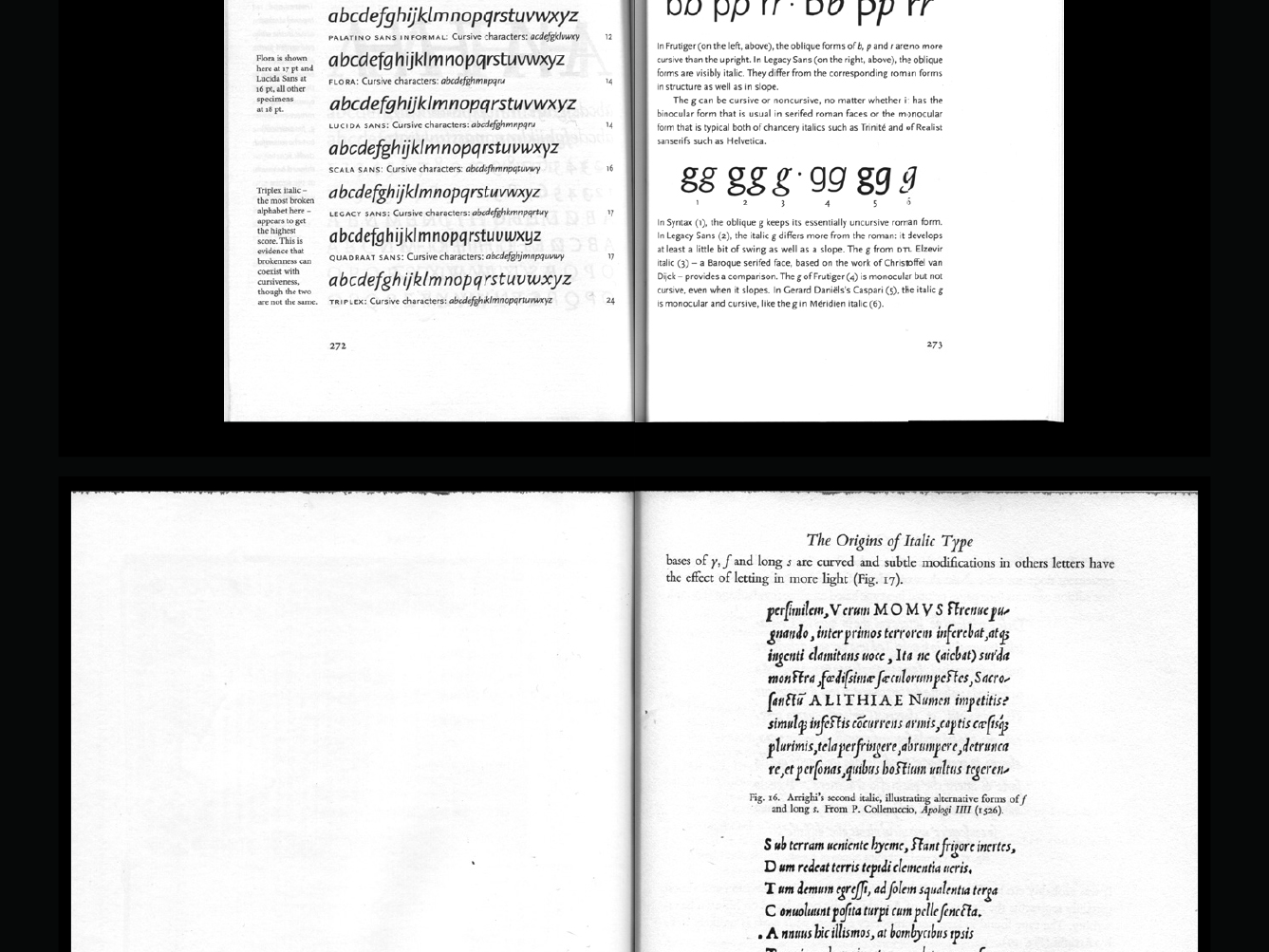 In the first few decades after the birth of printing in the Western world, several writing styles were developed, each of them inspired by one of the calligraphic models of the time. Amongst these, the fonts referred to as ‘italics’ first created in a Venetian printing shop, appear to be the first results of a proper type ‘design’, as a formal answer to a functional requirement – space saving, in that case. Nowadays, not a single text type family is released without the basic couple of a roman and its italic, the second one being designed according to the first and only sporadically used to distinguish some elements within the text.