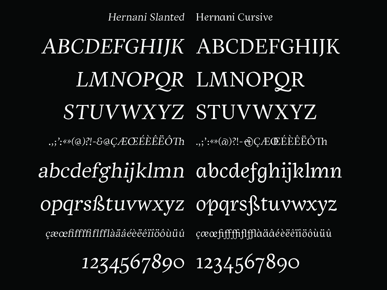 The Hernani type family was designed to question the coexistence of styles not only as a form of hierarchy but as a reading experience. Italic’s two main characteristics – slant and cusivity – are explored and confronted, creating a different layer of speech, drawing the outlines of our codes and habits to form unexpected links.