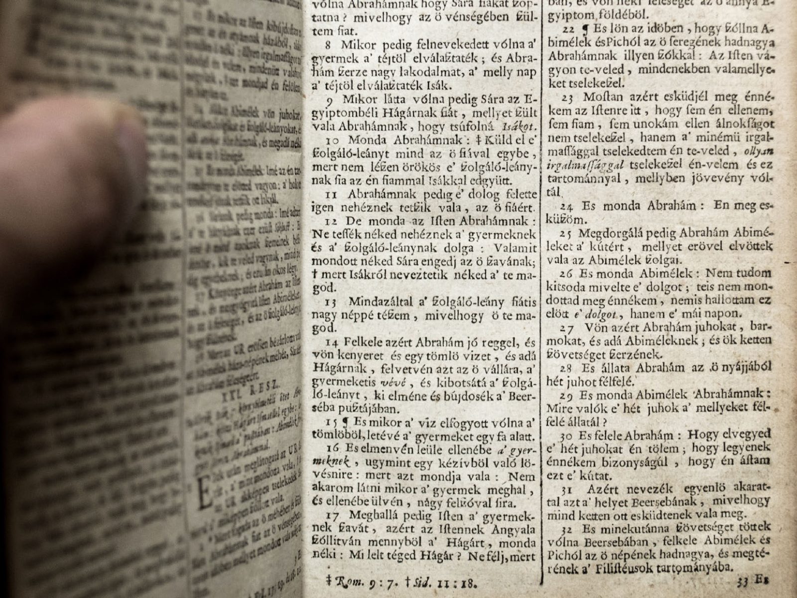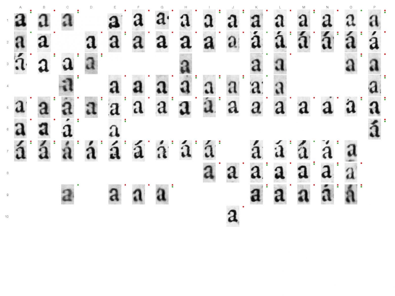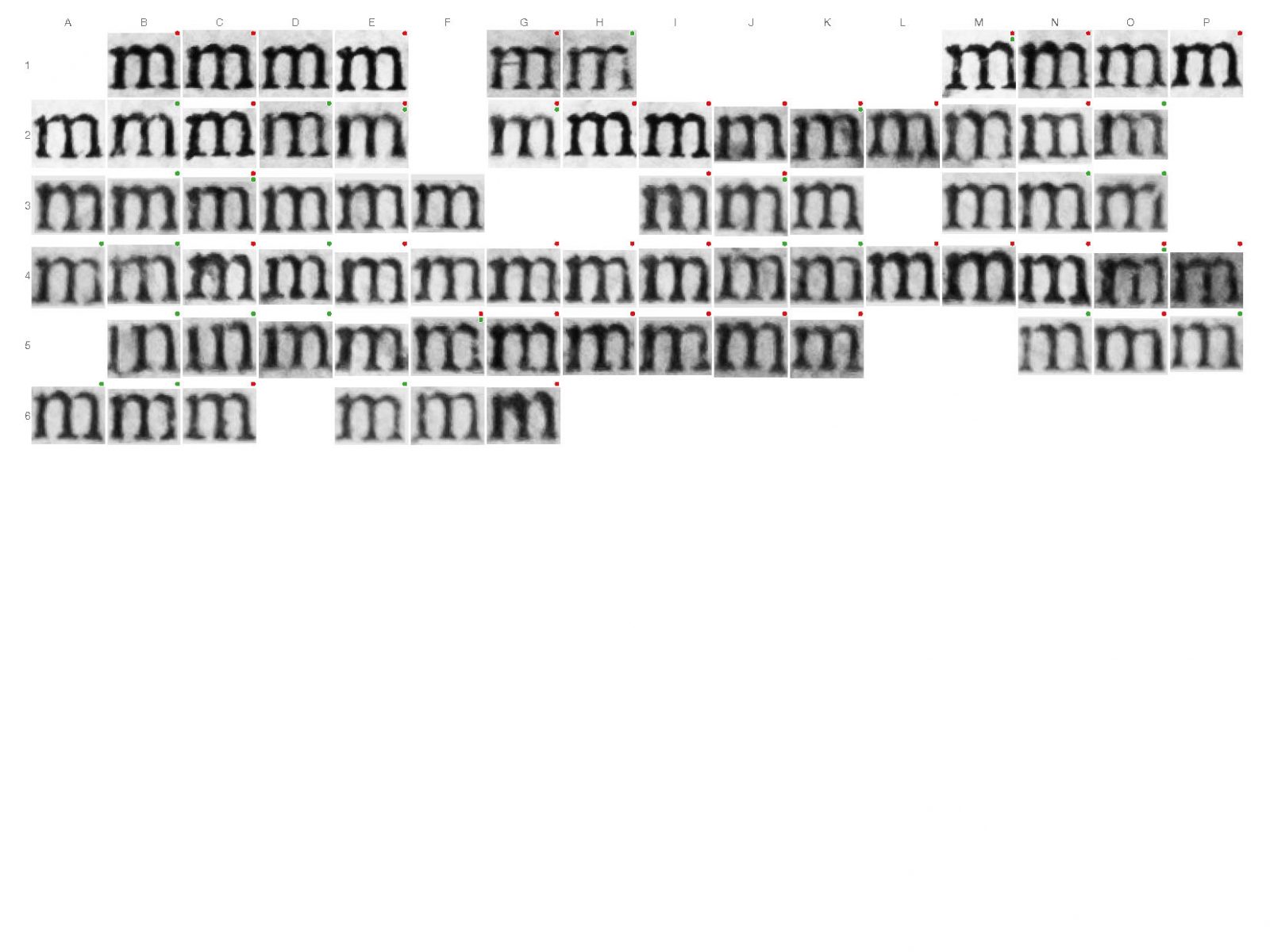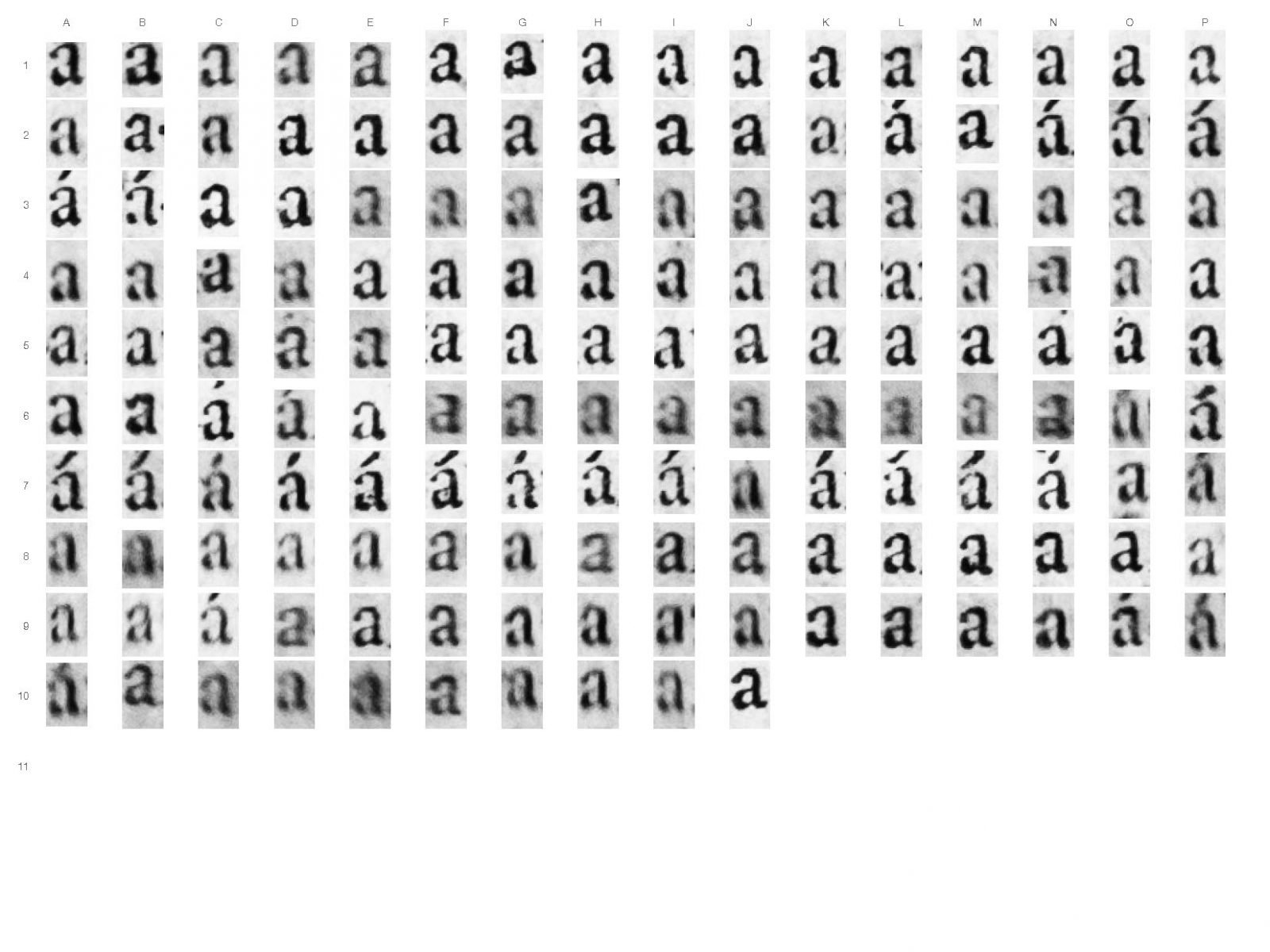 I have chosen the font of the Bible designed by Miklós Kis. This Bible is stored in Budapest, it shows a number of printing errors and varying type color. I used these attributes to build my survey on form variations. I then started collecting the marks, investigating these signs, these clues that reveal what makes a text lively, what gives it its consistency and is specific to a book.