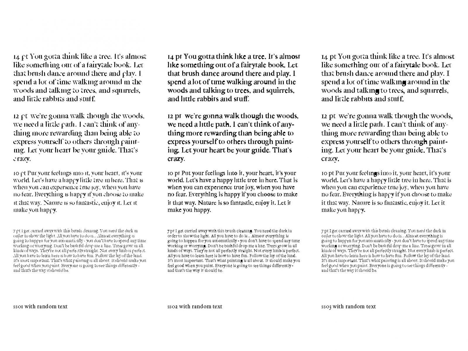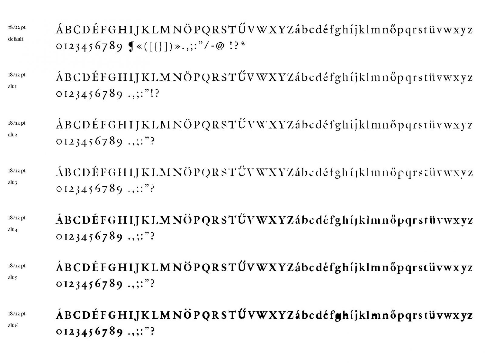 The six variations of my type family can work with alternates which increase the variables with eleven stylistic sets, generating the programmed randomness. Very much like a piano sonata played in the way of John Cage with a prepared piano, fitted with nails and rubbers. This work goes against the idea of progress. Even though I used sophisticated programming technics and variables for the shapes, I didn’t do so with the intention to achieve some kind of progress, but the opposite, to try to bring back something which we have lost in (printed) texts since the disappearance of analog printing techniques.