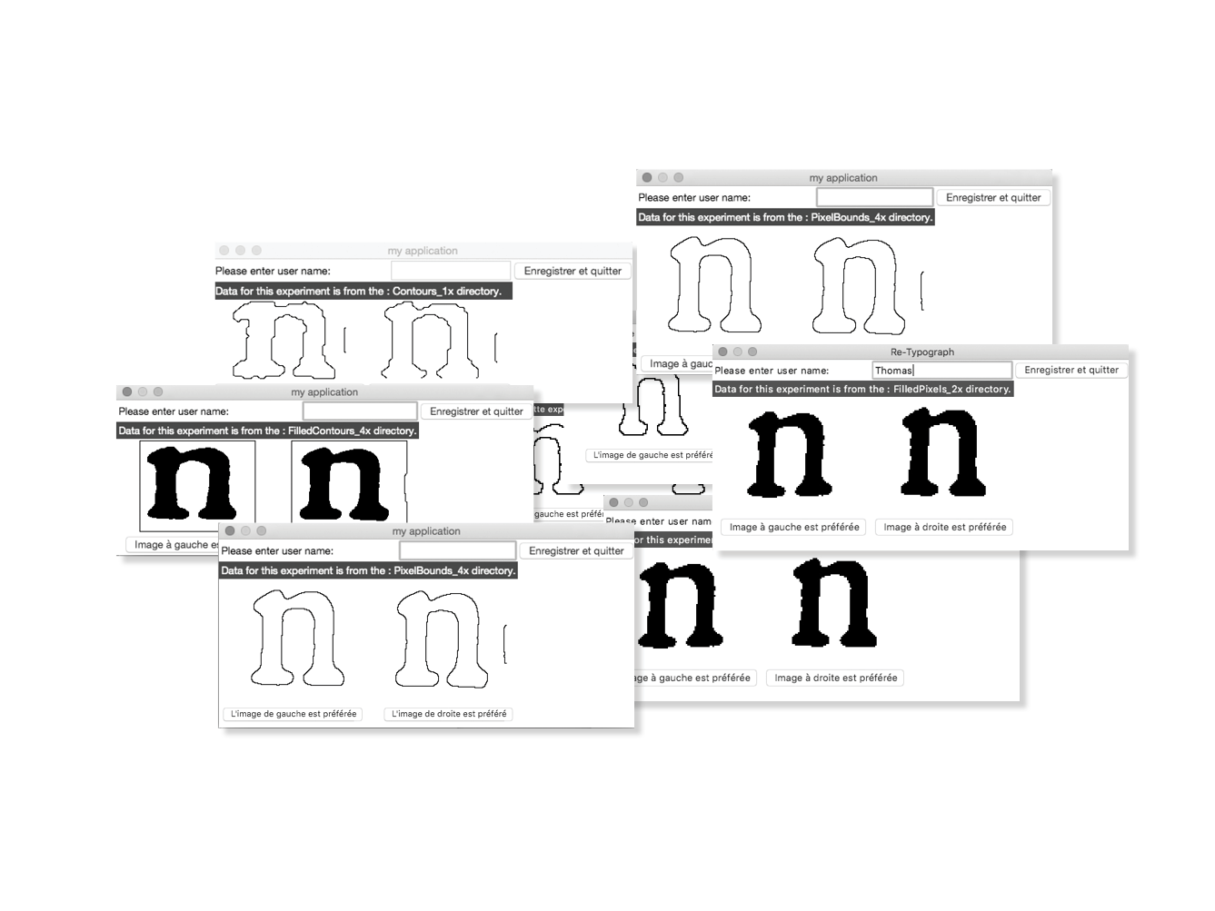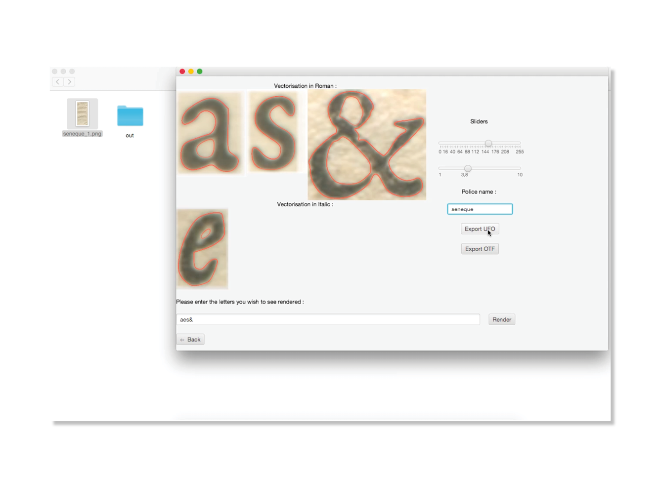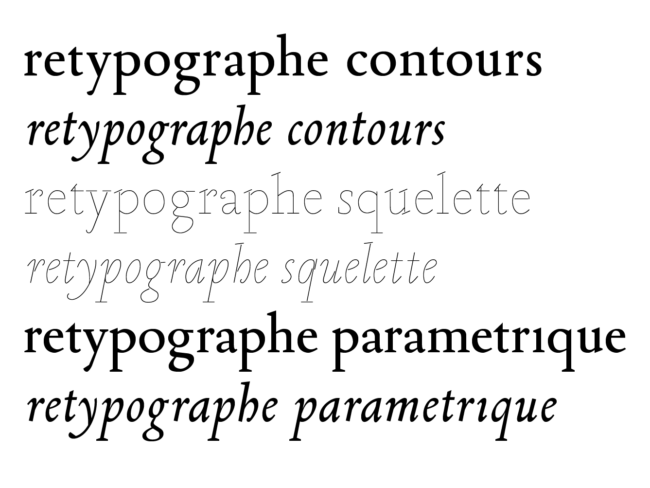 In 2013–2014, two ways of reconstructing the letters were explored: one by tracing the contours, and the other by calculating the inner skeleton of the letters. In order to check the validity of theses two methods, and to have a framework for communicating with the members of the team who are not familiar with typeface design, two revivals have been designed. The first one was produced by drawing manually the contours of the lettershapes. The second one was obtained by tracing manually the inner skeleton of the letters, and then by applying a parametric contour to that skeleton using the Parametric pen tool designed by Loïc Sander. The letters reconstructed by the program Re‑typograph are based on the average shape of every letter present in the original document. Eliza Barney Smith has worked on the optimization of that average shape. She tested different algorithms focusing on two major aspects of the problem: the clustering method and the way to calculate the average shape. About 125 combinations have been found so far and are being tested. These advances have been compiled in a unique program, Re‑typograph alpha, which enables us to obtain a font in the UFO format directly from the scan of a page.