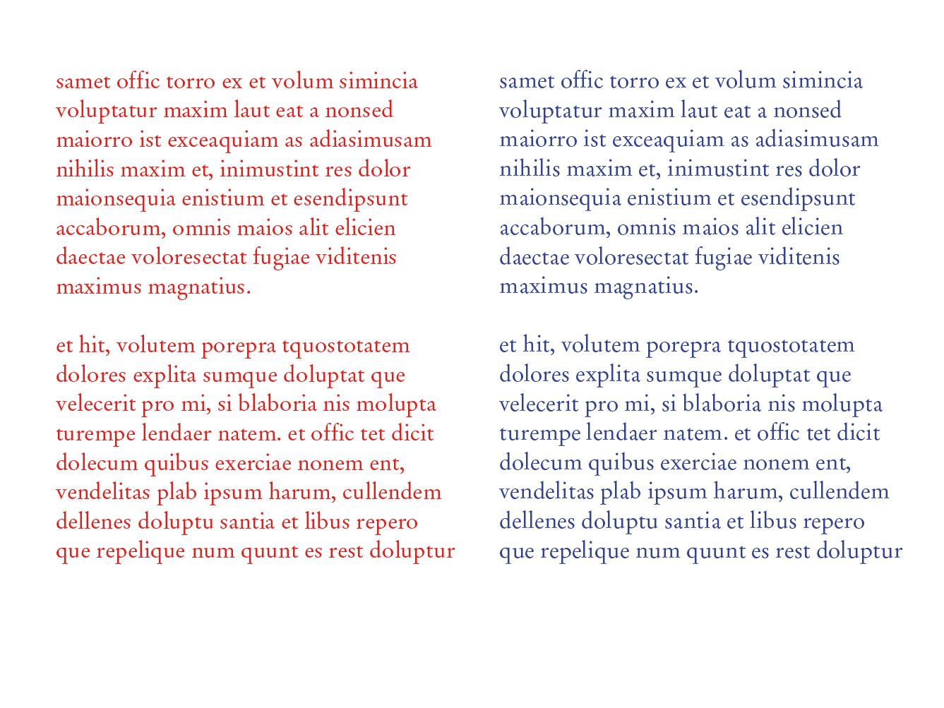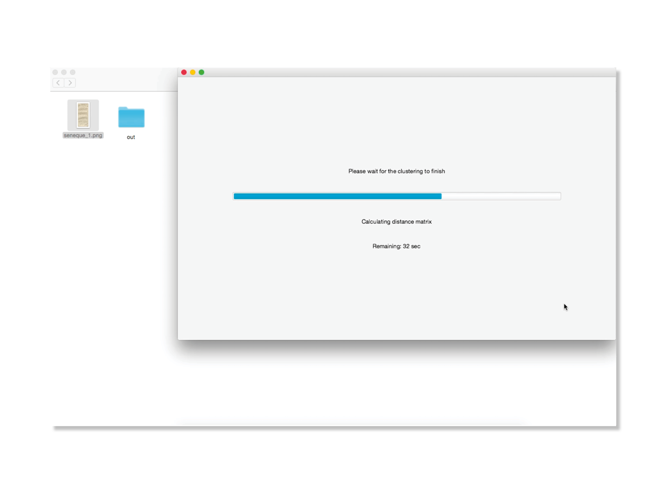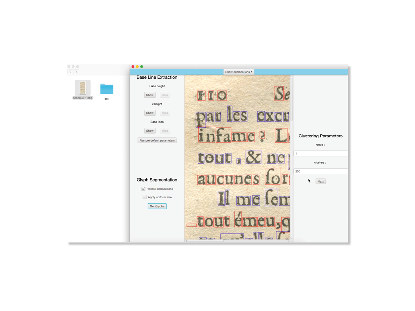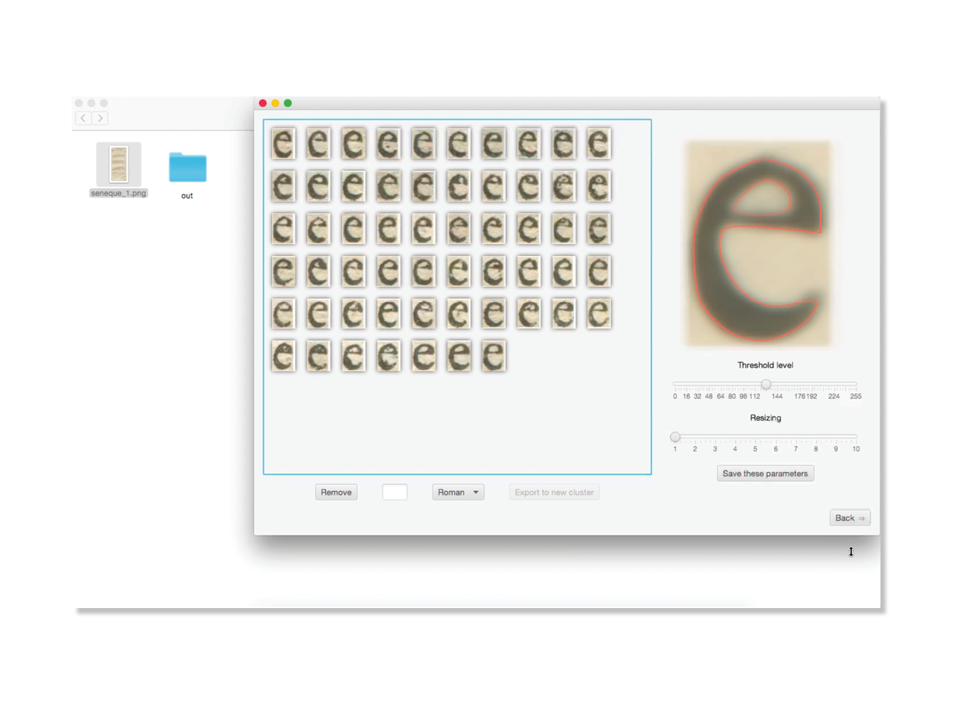 In 2013–2014, two ways of reconstructing the letters were explored: one by tracing the contours, and the other by calculating the inner skeleton of the letters. In order to check the validity of theses two methods, and to have a framework for communicating with the members of the team who are not familiar with typeface design, two revivals have been designed. The first one was produced by drawing manually the contours of the lettershapes. The second one was obtained by tracing manually the inner skeleton of the letters, and then by applying a parametric contour to that skeleton using the Parametric pen tool designed by Loïc Sander. The letters reconstructed by the program Re‑typograph are based on the average shape of every letter present in the original document. Eliza Barney Smith has worked on the optimization of that average shape. She tested different algorithms focusing on two major aspects of the problem: the clustering method and the way to calculate the average shape. About 125 combinations have been found so far and are being tested. These advances have been compiled in a unique program, Re‑typograph alpha, which enables us to obtain a font in the UFO format directly from the scan of a page.