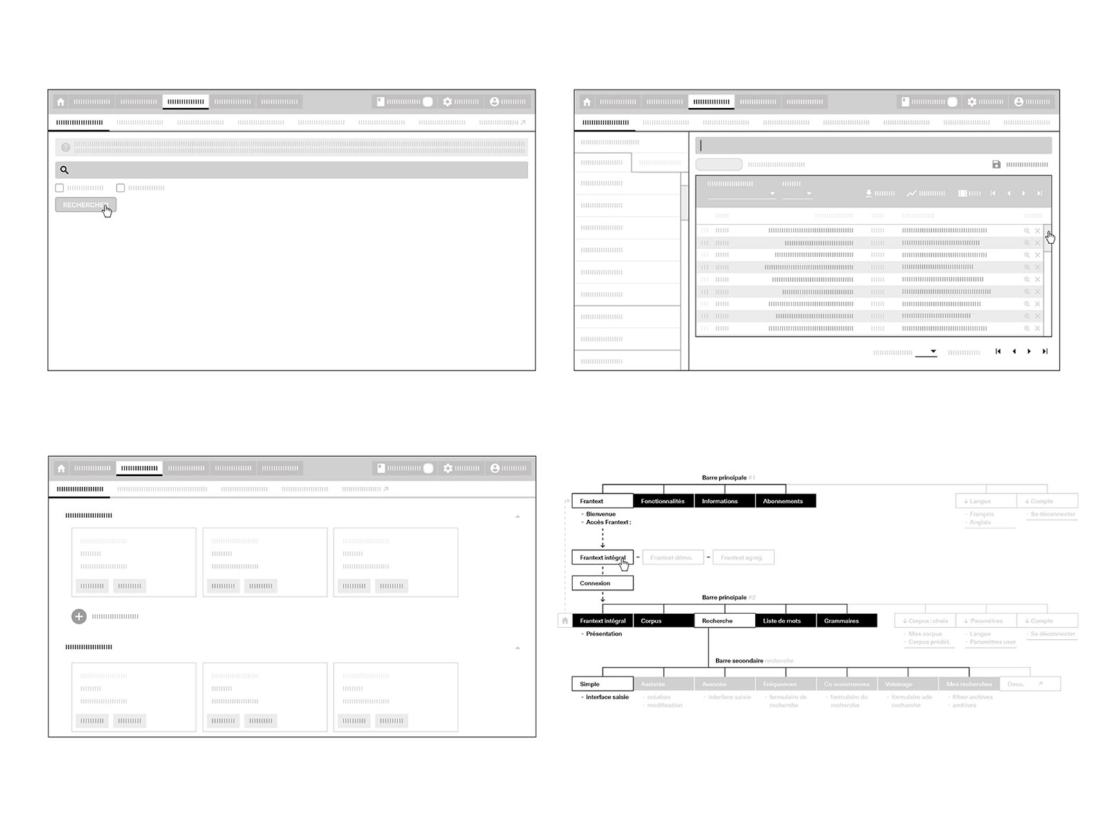 This research programme is a global comprehensive study of the graphic and typographic interface of Frantext, an online lexicographic tool developed by the ATILF (Analyse et Traitement Informatique de la Langue Française, Nancy). Frantext is a database of 5390 references sampled from the nineteenth to the twentieth century, coupled with a highly efficient text mining tool. It allows simple and complex searches and displays the results in the form of lists of extracts of texts of up to 700 characters. It is designed to understand the contexts of use and the evolutions of the searched grammatical form.