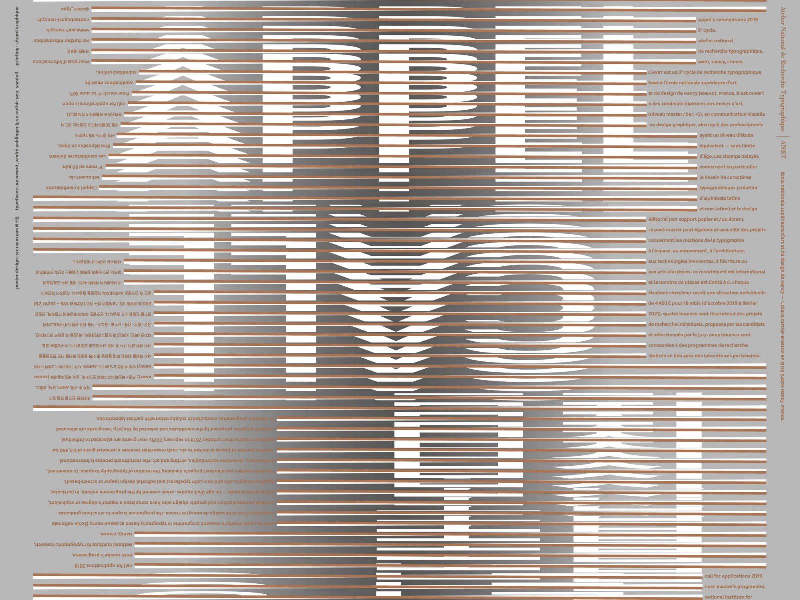 Korean, French and English: although these are three different languages, they involve (only) two writing systems: Latin and Hangeul. This dissonance between trilingualism and biscriptualism leads to questioning the ‘typographic matchmaking’ process – a common design pattern that seeks to harmonize different writing systems, mainly noticeable in multiscript type design or editorial design. This research project aspires to explore an opposite stance to ‘matchmaking’ by experimenting the ‘matchbreaking’ idea, which puts the emphasis instead on distinguishing each language, and magnifying a certain linguistic diversity.