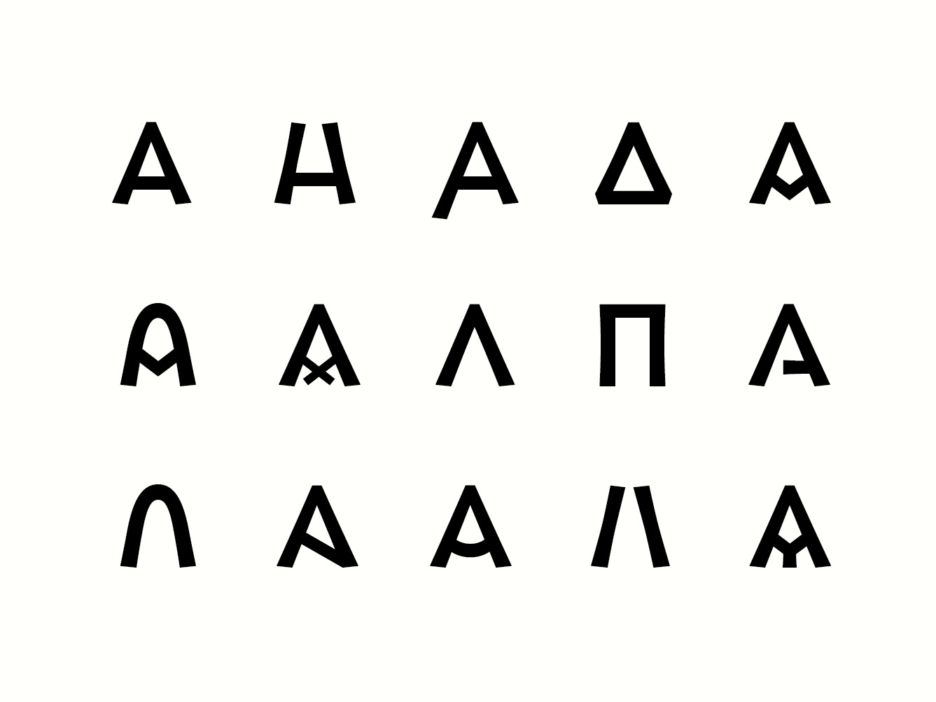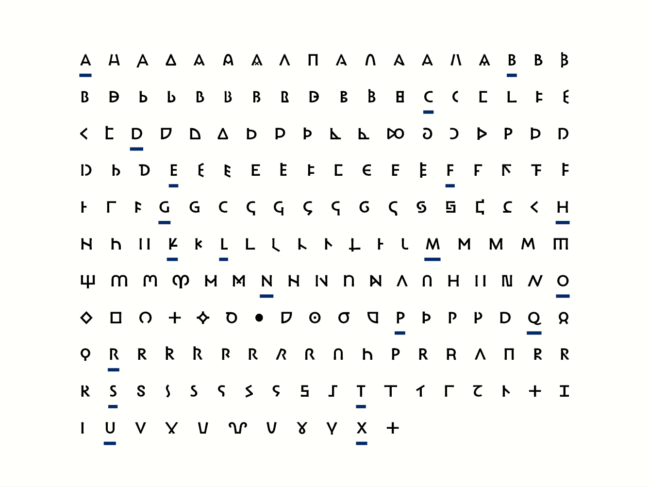 Therefore, a partnership between the BnF and ANRT has been set up with a view to develop a typeface that brings together, in a unified form, all identified stylistic variants. Based on the classification of the letters found on these coins, which was conducted by a team of researchers, it was possible to deduce an accurate and relevant interpretation of the various letterforms. This step questioned the level of information that should be represented by the glyph. Which details belong to the structure? How could endings or thickness of stroke appear, and should they appear? Where should the line be drawn between interpretation and transcription of the sign? Throughout this first stage of work, it was necessary to keep in mind the graphic unity of the typeface. This led to a reflection on the coherence of the letterforms within the font. How can glyphs, whose structure and appearance vary greatly, work together? Up to which point can the shapes be standardized, while remaining compatible with the project’s aim? Composed mainly of capital letters, the typeface, whose primary use would be for scientific publications, questions the readability and identification of each glyph independently of the others within a text.