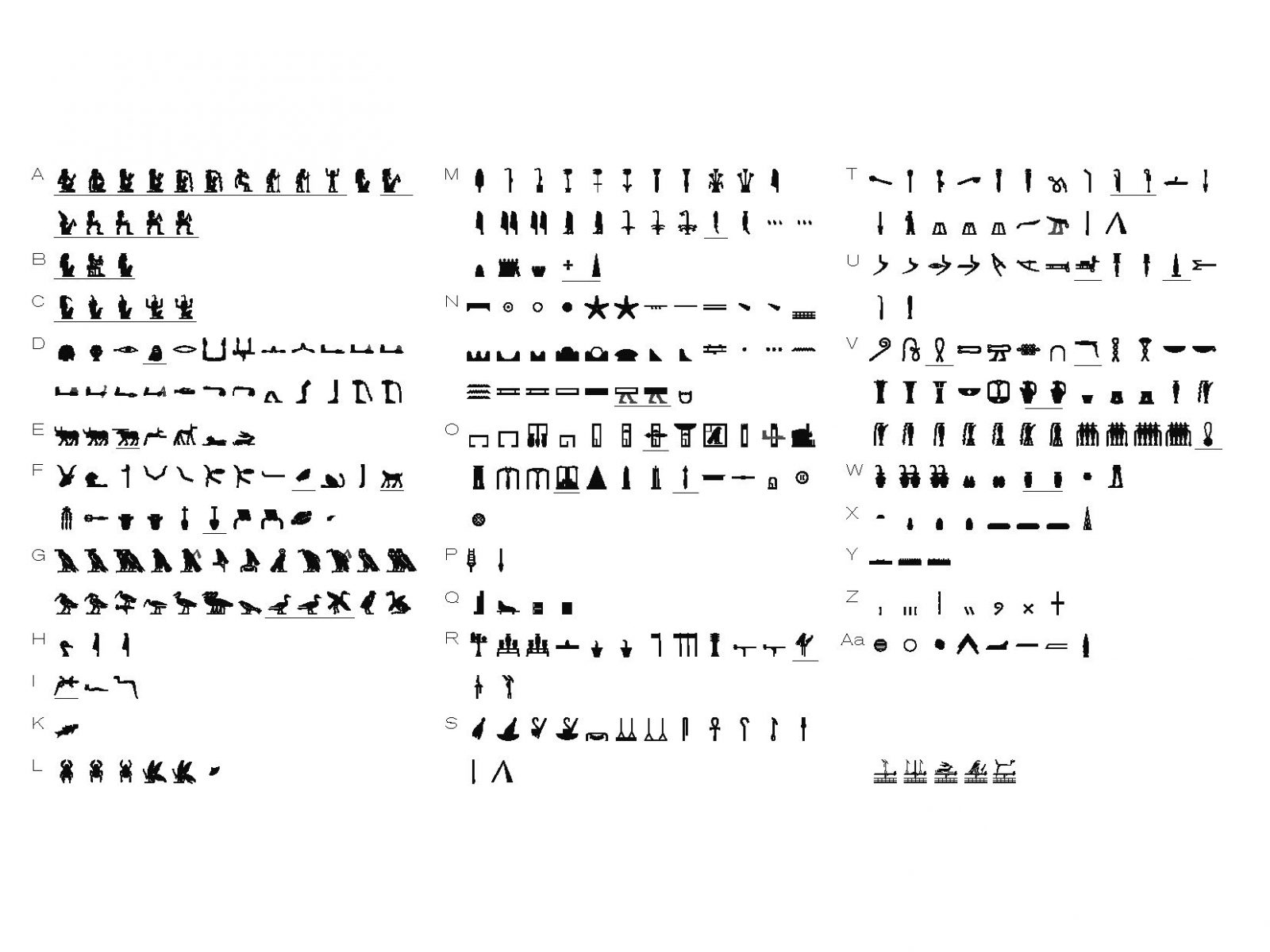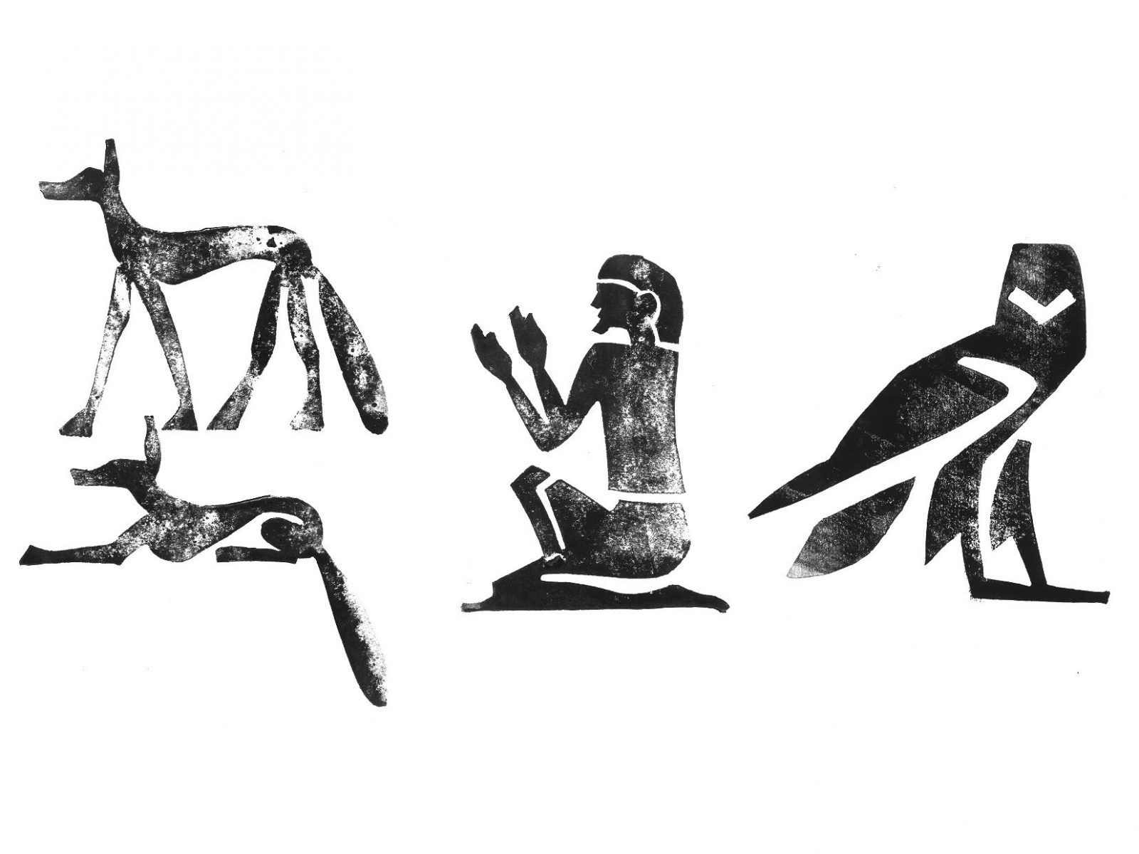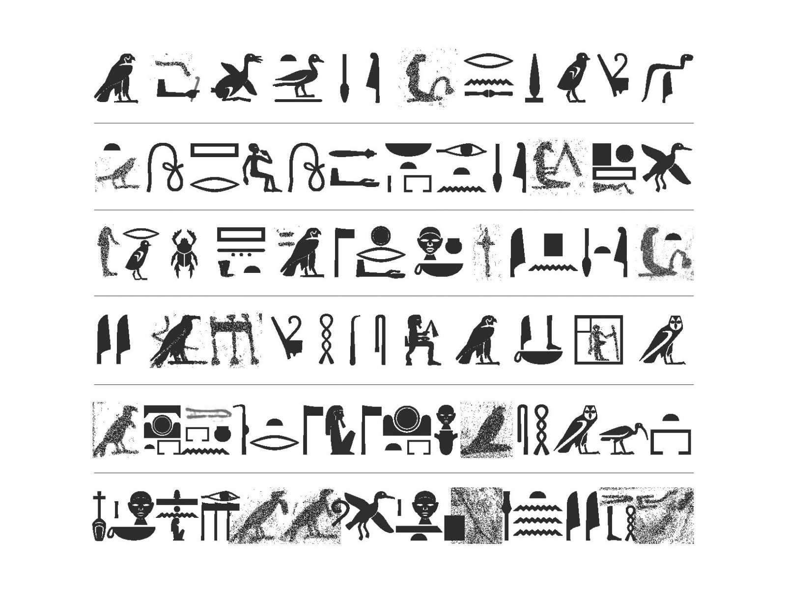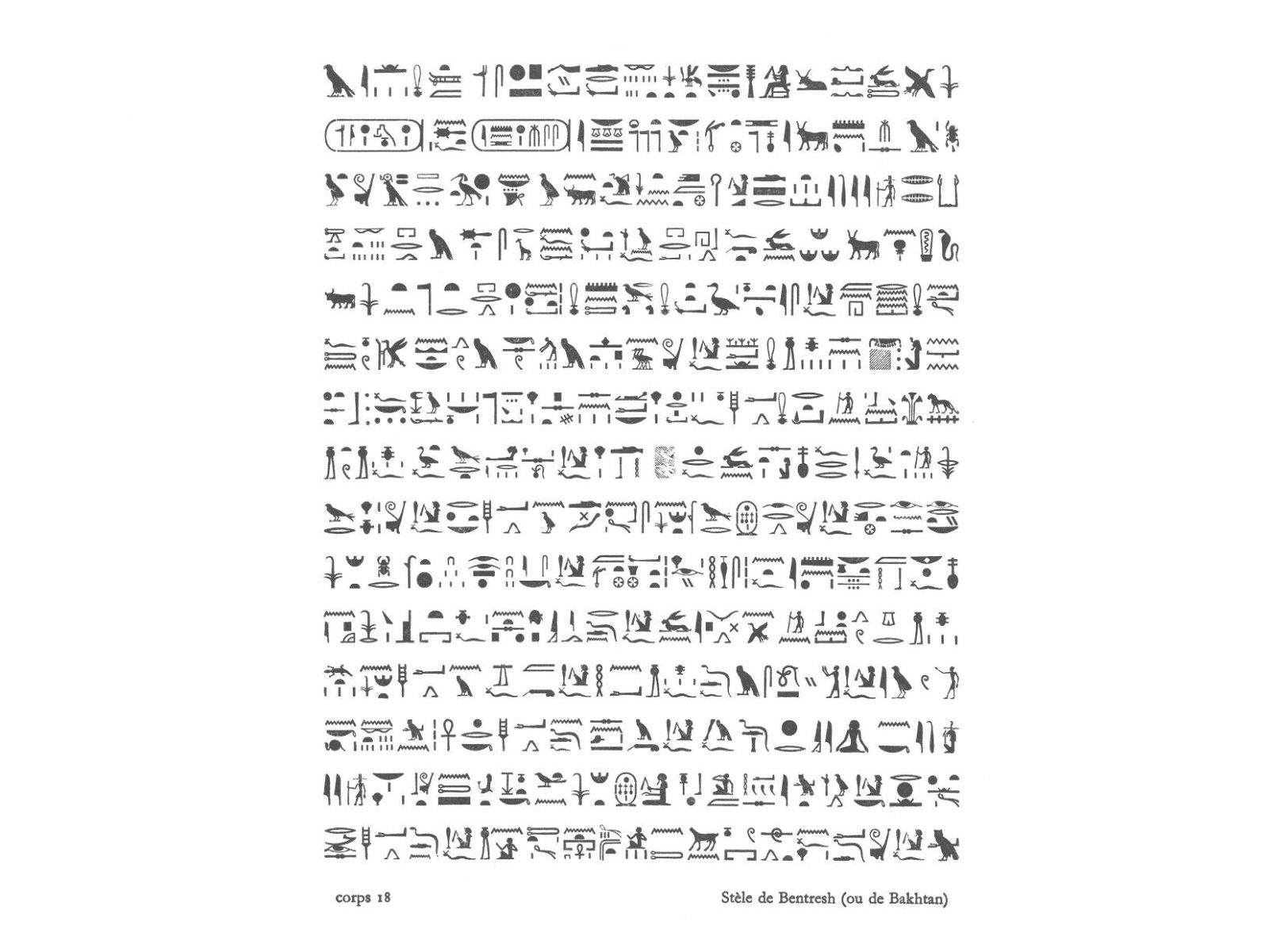 Ainsi, le caractère typographique est un outil s’inscrivant au sein d’une succession de codes (photographie-facsimile / transcription typographique / translittération / traduction) permettant d’inscrire le texte hiéroglyphique dans une forme accessible aux contemporains. En étudiant les publications où ils sont utilisés, j’ai remarqué que les caractères hiéroglyphiques renvoient toujours à un autre état du texte (facsimile ou photographie), et n’ont donc pas à prendre en charge la portée sémantique très importante dans l’interprétation des hiéroglyphes: le caractère hiéroglyphique sert à renvoyer le lecteur vers un autre document. En cela, il agit comme un signal. Cette fonction nécessite que la forme du signe soit détachée de ses références épigraphiques pour ne pas s’approcher d’une période de la langue déterminée, justifiant de déterminer la structure et les proportions des signes par la synthèse de plusieurs sources. Par des allers retours entre le signe originel et/ou transcrit de la main du chercheur et le signe schématique typographique, j’ai mis en place des formes justifiées par des sources épigraphiques identifiées, reconnues et validées par les égyptologues. Par ces échanges, nous assurons avec les égyptologues du VÉgA une scientificité au système typographique faisant défaut aux systèmes de transcription existants. En établissant ces formes, j’ai conçu un modèle typographique, une structure dont l’enveloppe graphique répond à une logique qui lui est propre, me permettant de poser un regard sur une forme distante de plusieurs millénaires.