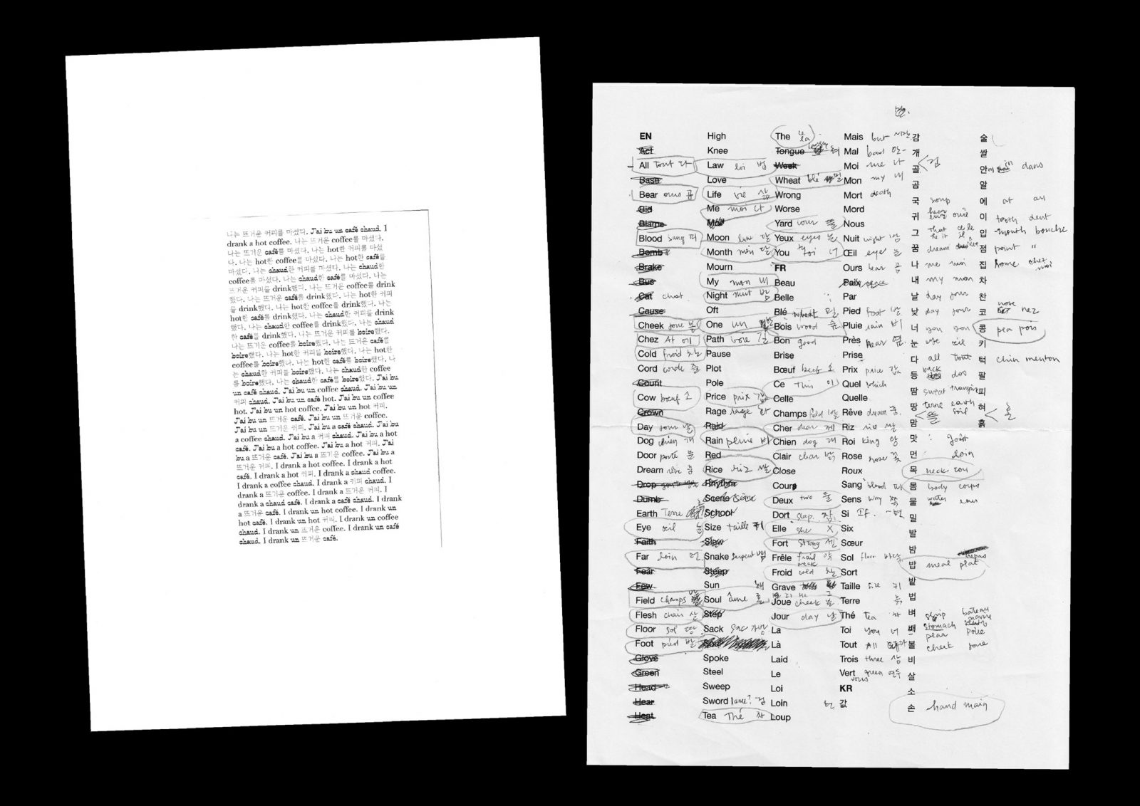 Le coréen, le français et l’anglais: ce sont bien trois langues différentes avec leur propre syntaxe et vocabulaire ; néanmoins, ils ne s’agit (que) de deux systèmes d’écritures différents : le latin et le hangeul. Cette dissonance entre le trilinguisme et le biscriptural soulève des questionnements autour du ‘typographic matchmaking’, cette tendance à l’homogénéisation des systèmes d’écriture que l’on retrouve bien souvent dans les créations de caractères multiscriptes ou dans le design éditorial. En prenant le contre-pied de cette tendance, ce projet de recherche vise à mener des expérimentations de ‘matchbreaking’, dans lesquelles chaque langue se distinguerait de ses compagnons, prônant l’éclectisme.