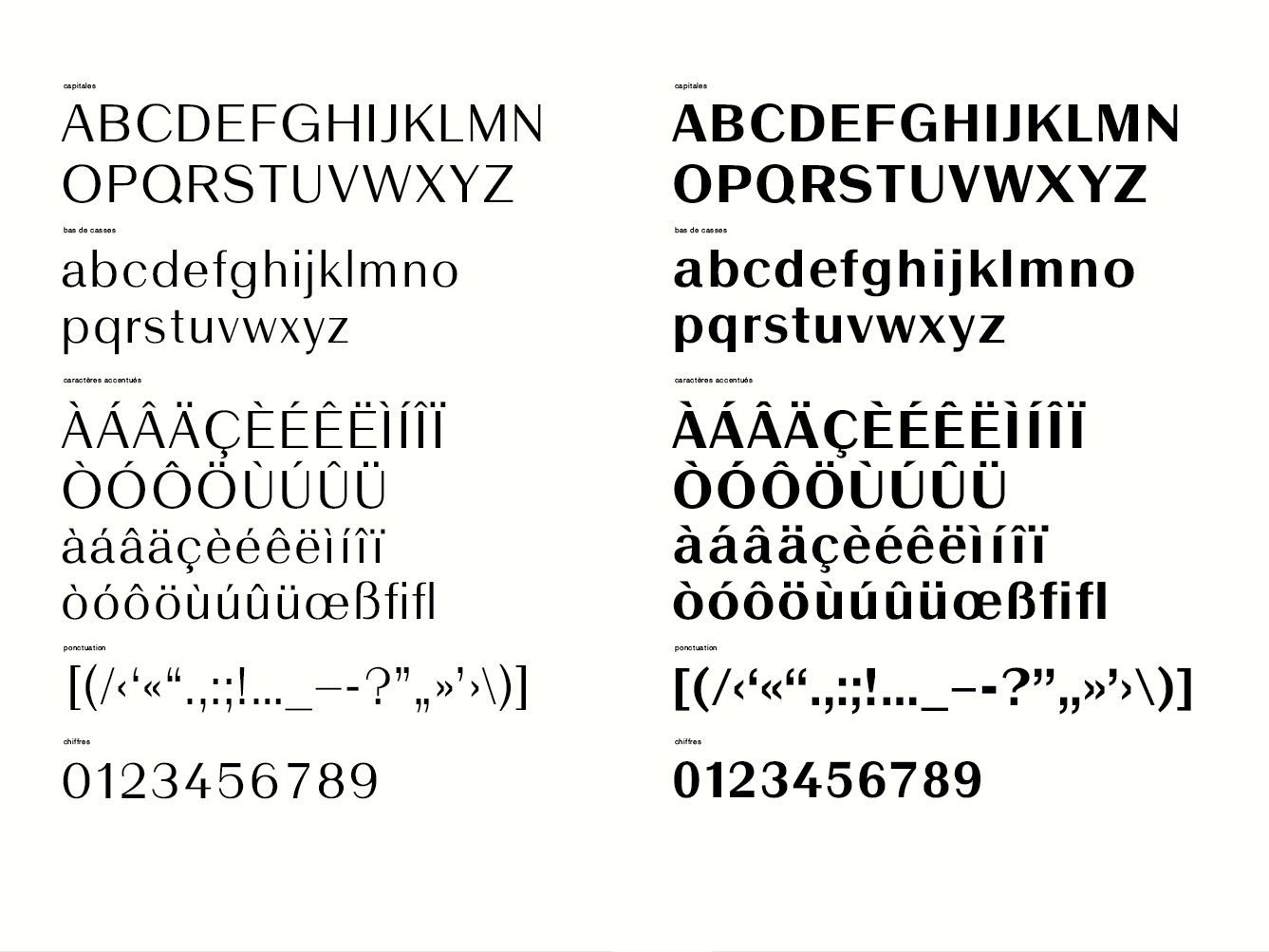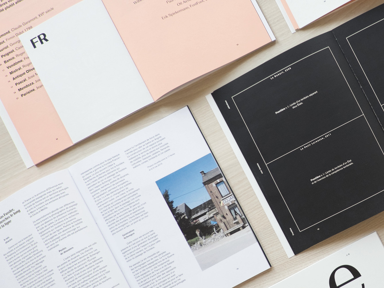 Sur le plan typographique, un glissement s’opère tout au long du livre entre deux caractères : l’Akzidenz Grotesk d’une part, et une didone à l’accent germanique d’autre part, le Berthold Walbaum. Leur rencontre produit un nouveau caractère, une linéale contrastée nommée Akzidenz Modern. Cette hybridation s’opère progressivement, et modifie discrètement la tonalité du texte.